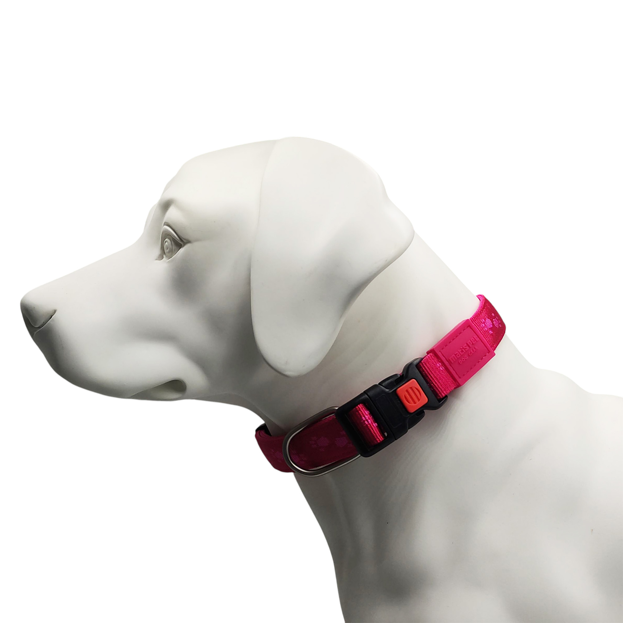 Click dog collar is a great choice for everyday use. The Matis Doggy Paws neoprene collar is made of strong and durable polyester webbing and is lined with neoprene. The combination of webbing and neoprene ensures comfort and softness when worn, as well as safety and strength.The collar can be tightened or loosened using the slide, and the metal D-ring is for attached with a leash. The collar has a safety buckle that can be locked to prevent unwanted opening.